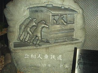 夕食をまだ食べていなかったので石川屋というラーメン屋へ向う。その途中に、豆相人車鉄道の熱海駅舎跡の記念碑があった。伊豆と相模を結んでいた鉄道で、東海道本線が御殿場線経由だったころの名残である。