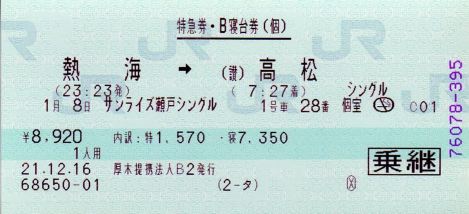 熱海23:23〜07:27高松 寝台特急サンライズ瀬戸 シングル