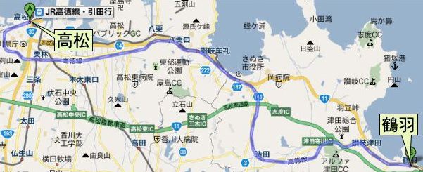 これから高徳線の引田行きで鶴羽駅へ向かう。列車は2両セミクロス、車掌付きである。乗客は少なくボックス席を一人で占領できる。高松駅を出発した列車はまずは西へ向かい、急カーブして東へ方向を変える。これも高松が連絡船との接続駅だった時代からの名残である。
