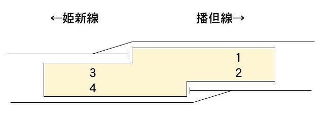 姫路駅で在来線ホームへ移動する。以前姫路に来た時には、駅が高架になる工事中であったので、播但線や姫新線のホームは地上であったが、高架工事が終了した駅はとてもきれいになった。これから乗る播但線ホームは1,2番線だが、姫新線ホームの3,4番線と共用である。これだけだとよくわからないと思うので、図を示す。