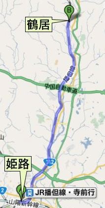 30分余りで鶴居駅に到着した。鶴居駅は2面2線で1線スルーになっている。降車後に姫路から来た特急はまかぜ3号が通過していった。1線スルーは通過列車がスピードを落とさずに通過できるので、単線区間ではスピードアップに貢献している。駅周辺を探索していると、一度寺前まで行った列車が戻ってきた。それに乗って姫路まで戻る。