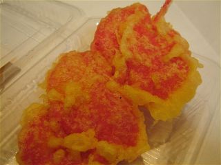 泉佐野駅から徒歩2〜3分のところのスーパーに何気なく入って、食品売り場を歩いていたら、あった、あった! 「紅ショウガの天ぷら」が!!! 関西のスーパーなどでは当たり前の食材ですが、首都圏のスーパーには絶対置いてない。2枚が80円だったので2枚買い、ホテルで食べてみた。なかなかの珍味である。食べ過ぎると舌が真っ赤になりそうだ。