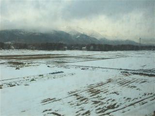 京都から山科トンネルを抜け、湖西線に入る。湖西線は高架が多く、右手に琵琶湖がよく見える。時折小雨が落ちてきてはまた上がるといった天候が続く。琵琶湖が見えてからしばらくしてから左手の山々には雪が積もっているのが見える。さらにしばらくすると平地にも雪が積もっている。