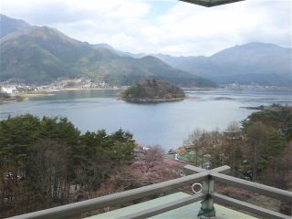 食後は、まずホテル6階の展望ラウンジに行きました。エレベーターは5階までで、そこからは階段で6階に上ります。階段の左右には富士ビューホテルの歴史がわかる様々な写真が飾られていました。富士ビューホテルは箱根の富士屋ホテルの系列なんですね。6階の展望ラウンジは東側と西側に二ヶ所あり、それぞれ270度くらいが展望できます。北側は河口湖、そして南側は富士山が見えるはずですが、見えたのは河口湖だけです。富士山はまだ雲に隠れてます。