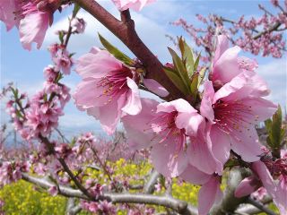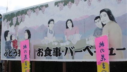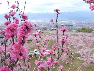 さて、ホテルを出たら、次に目指すのは桃源郷です。河口湖大橋〜御坂峠を通って甲府盆地に入っていきます。4年前には家族でみさと桃源郷公園に来ていますが、今回は御坂農園です。レトロな看板にちょっと引いてしまいましたが、農園内の桃と菜の花はとてもきれいでした。桃色と黄色のコントラストは見事です。