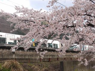 ちょうど列車が到着しました。ホームの位置が高いので、車内からも桜が眺められそうです。