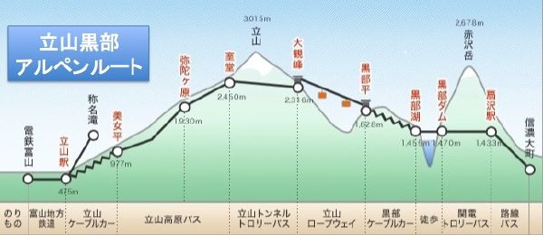 二日目の行程は、富山ー<バス>ー立山ー<立山ケーブルカー>ー美女平ー<立山高原バス>ー室堂ー<立山トロリーバス>ー大観峰ー<立山ロープウェイ>ー黒部平ー<黒部ケーブルカー>ー黒部湖ー黒部ダムー<関電トロリーバス>ー扇沢ー<バス>ー松本ー<中央本線>ー新宿です。なんと言ってもこのツアーのメーンイベントはこの立山黒部アルペンルートです。