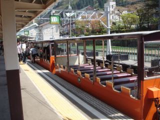 ここからは写真のようなトロッコ列車に乗ります。全面オープンの合計13両編成です。線路の幅は762mmととても狭く、新幹線の線路の幅の約半分しかありません。乗客からは「まるでTDLのイッツ・ア・スモール・ワールドね」などという言葉も出て、ここから鐘釣(かねつり)駅までの片道約1時間の楽しい旅の始まりです。