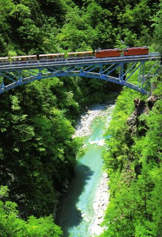 トロッコ列車は宇奈月駅を出発してすぐに、赤いアーチの新山彦橋を渡ります。沿線で最も長い166m、高さ40mで、列車の音が山彦となって宇奈月温泉街に響くことからこの名前になりました。二代目の橋で、初代山彦橋は遊歩道になっています。列車に乗っていると橋自体の写真は撮れないのです。