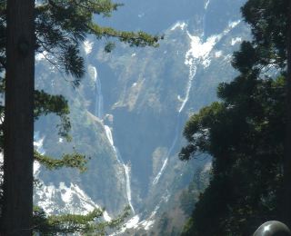 向って左側の滝が称名滝(しょうみょうだき)です。350mという日本一の落差を誇る滝で、四段からなっています。右側にはハンノキ滝が見えV字型になっています。ハンノキ滝は春に現れる季節限定の滝です。
