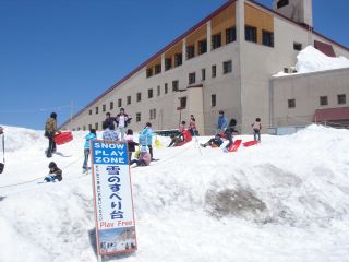 室堂ターミナル(2450m)は大きな建物でホテル立山も併設されています。近くには雪のすべり台があり子供たちが無邪気に遊んでいました。ほほ笑ましい光景です。
