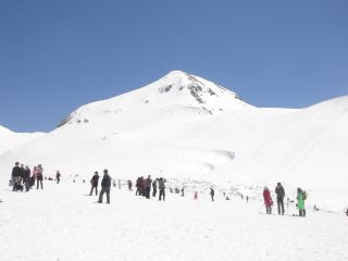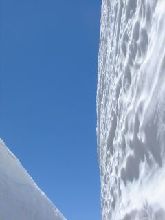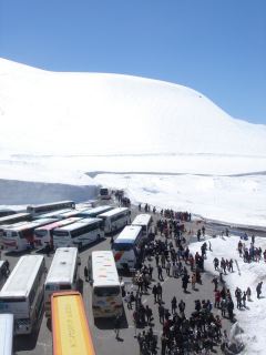 室堂ターミナルから5分ほど歩けば雪の大谷です。ものすごい高さの雪の壁です。倒れてこないのが不思議なくらいです。今年の雪の高さは15mです。今までで最高は昭和56年で、その時は22mもの高さだったようです。現在ではGPSを使って除雪する場所を特定しているようです。