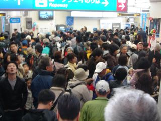 室堂から大観峰まではトロリーバスで向います。このトロリーバスは立山トンネルを通っていて、雄山の下を黒部側に走ります。終点は大観峰(だいかんぽう)です。ここは場所が狭くて、改札口付近はごらんの通りの大混雑です。ラッシュアワーより混んでいますが、ここで1時間30分ほど時間がありますので、展望台に向います。