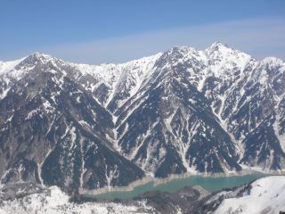 大観峰(2316m)からの雄大な眺めです。風もなく雲一つない青空で、いうことありません! 眼下には黒部湖が望めます。向って左側は赤沢岳(2678m)、右側の一番高いのが針ノ木岳(2821m)でそのすぐ左側がスバリ岳(2752m)です。ただただ感嘆するばかりです。
