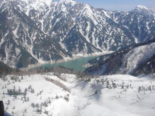 大観峰でゆっくり絶景を楽しんだ後、今度はロープウェイで黒部平(1828m)まで下ります。このロープウェイは1.7kmもの間に支柱が一本もないことが特徴です。雪崩の被害を食い止めるためと、景観を損なわないためだそうです。黒部湖が少しずつ近づいてきます。