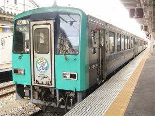 これが車両です。2両編成のセミクロスシートです。これから約4時間にわたる鈍行列車の旅が始まります。