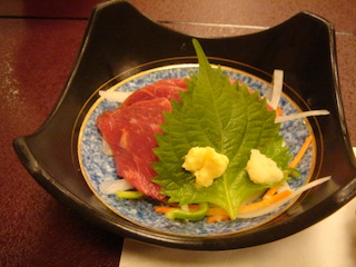 村営の施設なので夕食は質素なのだろうと期待していませんでしたが(失礼!)、意外にも美味しい料理がたくさん並べられていました。これもサプライズです。写真は馬刺しです。