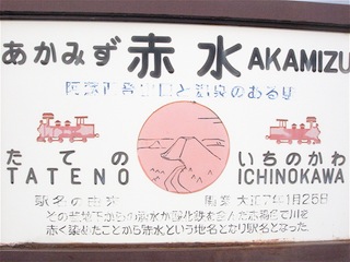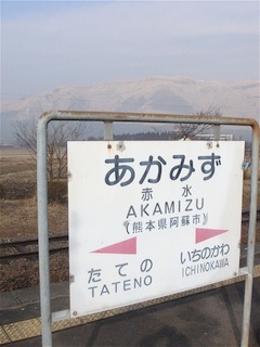 人吉を出て、2時間41分で赤水駅に到着した。駅名標の向こう側に阿蘇外輪山が見える。