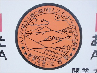 秘湯の里とスイッチバックのある駅」と書いてある。駅名標の中央部には、「パノラマ拡がる地に湯の里とスイッチバックがある駅」と書いてある。