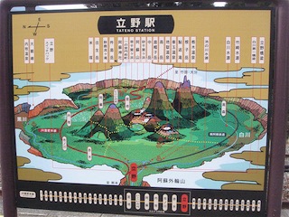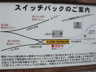 観光案内の入った駅名標もある。ホームにはスイッチバックのご案内もあった。瀬田駅の標高は約170mで立野駅は標高277m、スイッチバックの転向線は標高306m、そして赤水駅は標高465mと書いてある。ものすごい高低差である。