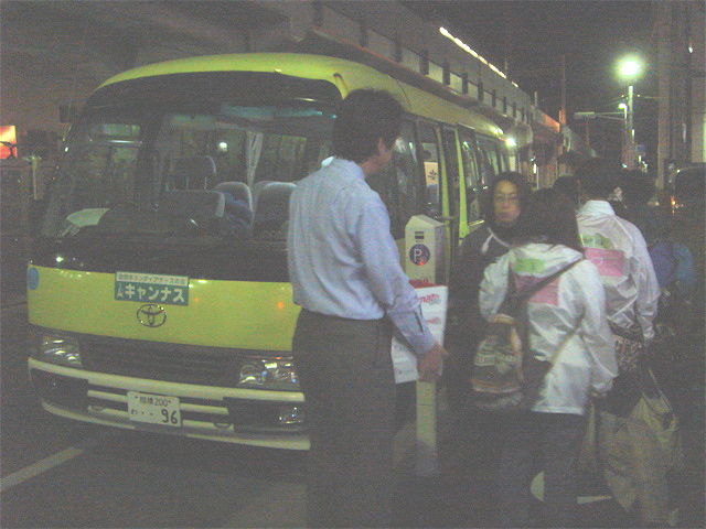 藤沢駅から歩いて5分ほどのキャンナス本部にはすでに多くの人が集まっていました。ここでキャンナスの統一されたウインドブレーカーを渡され、それに名前を書いて着込むと、初めて会った人が多いのに、なぜか一体感が出てきました。今日は、マイクロバスと車2台の合計3台で出発するようです。物資の積み込みと、注意事項の確認などをしていると、出発時刻の22時がすぐにやってきました。