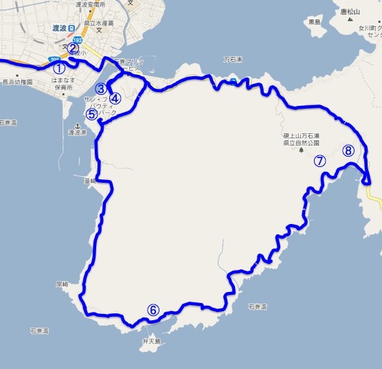 【地図1】 (1)石巻市立渡波保育所、(2)JAわたのは、(3)船で塞がれた道路、(4)祝田一区集会所、(5)サン・ファン・バウティスタパーク&宮城県慶長使節船ミュージアム、(6)小竹浜公民館、(7)峰耕寺、(8)蛤(はまぐり)浜避難所