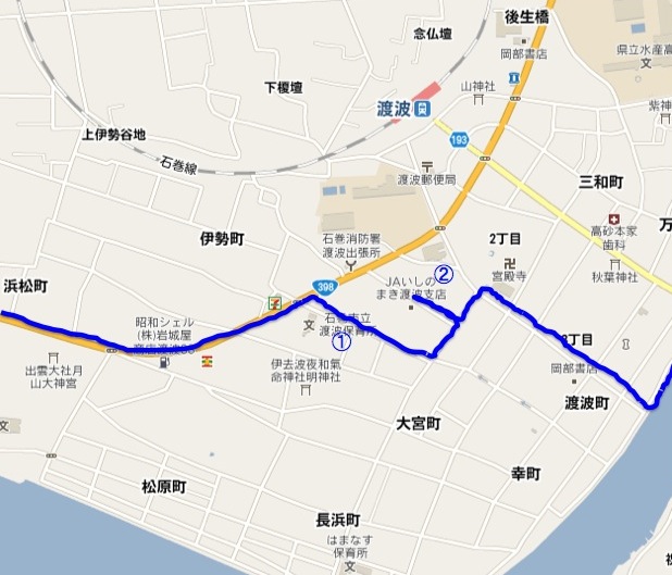 【地図2】 (1)石巻市立渡波保育所、(2)JAわたのは