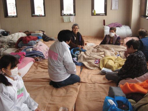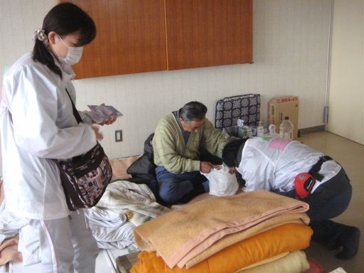 早速、私の友人(Mi医師)に電話したところ、忙しいのにわざわざ湊中学校に来てくれました。久しぶりの再会の喜びに触れる暇もなく短い会話を交わしました。そしてMi医師のところで働くスタッフ二人と、私とMo医師で渡波(わたのは)中学校に行きました。渡波中学校は湊中学校より約3km東になり、より海の近くです。避難者の生活する避難所というものに初めて足を踏み入れ、被災者の健康状態をチェックしました。環境の影響なのか、咳が止まらないという訴えが多いようでした。