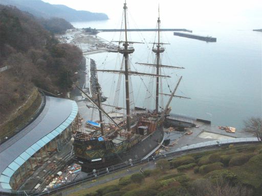 元の道に引き返し、脇道にそれてトンネルをくぐるとテーマパークが見えてきました。サン・ファン・バウティスタパークです。宮城県慶長使節船ミュージアムも併設されています。もちろんテーマパーク自体は閉鎖されていますが、3月末までは避難所として利用されていたようです。ミュージアムに展示されている船はありましたが、周囲はがれきで埋め尽くされ、見学エリアの大きな窓ガラスはすべて割れていました。