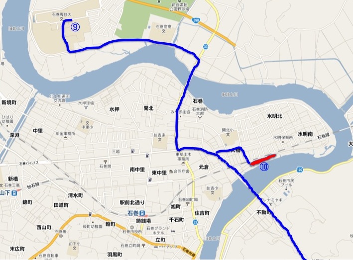 【地図7】 (9)石巻専修大学、(10)水明南地区(赤線は我々の調査地区)