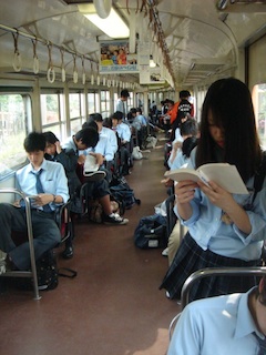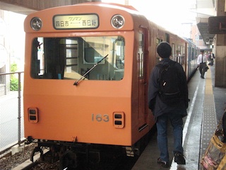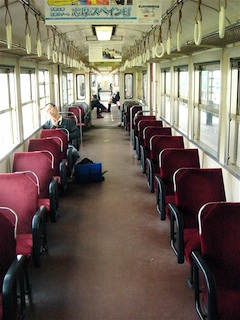 【車内】3両編成で真ん中がロングシート、両端が運転席方面を向いた固定型クロスシートとなっています。線路が狭いので列車の幅も狭いのです。クロスシートの座席も左右一列しかありません。今日は土曜日ですが、高校生が圧倒的に多く、通学専用列車の様相です。
