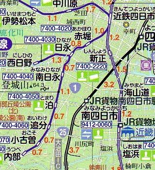 再掲【近鉄内部・八王子線路線地図】西日野からは内部線の南日永駅まで歩きます。約1kmほどです。
