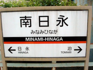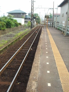【日永駅到着】分岐駅である日永駅に到着しました。左後方に向かって西日野駅へ行く線路が延びています。