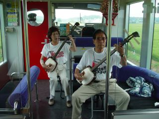鯵ヶ沢駅で海岸線に別れを告げる。そしてここから五所川原までの20分間は、先頭の展望室、つまり私の目の前で、津軽三味線の生演奏と民謡で楽しめる。乗っていること自体が観光になっている。迫力ある津軽三味線の演奏が終わると五所川原駅に到着した。