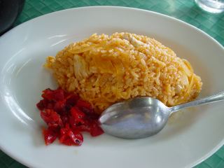 レトロな内装に合わせて、注文もチキンライスとちょっと昔の人気者にしてみた。ほどなく出てきたチキンライスは懐かしい味でとても美味しい。おまけにわかめと豆腐のみそ汁付きである。