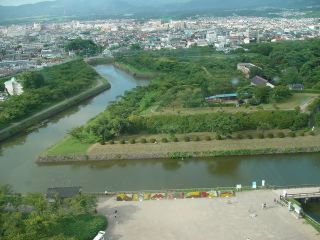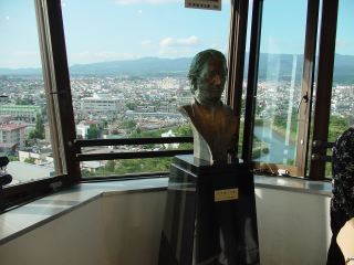 五稜郭タワーに登ると五稜郭の形がよくわかる。タワーには土方歳三の像があった。一緒に記念撮影をしている観光客が多い。この時期、こちらでは新撰組ブームである。
