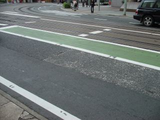 市内の中心部にある徹明町電停だが、道路に緑色の安全地帯マークだけでホームがない。これでは慣れていないと乗るのに怖い。