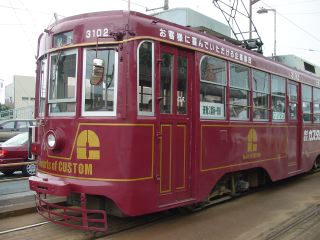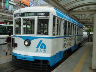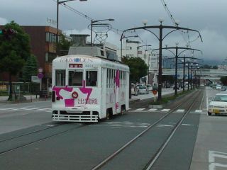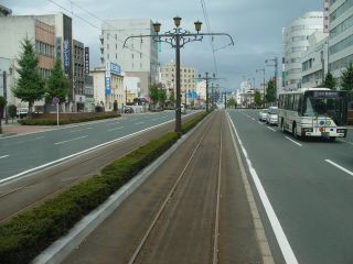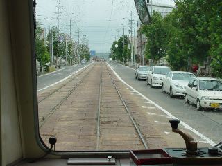 新川電停から再び電車に乗り駅前方面へ。センターラインに並んだ街灯付きの架線柱が美しい。いろいろな車両も楽しいし、なかなかきれいな路面電車である。