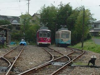 競輪場前電停の小さな車庫があり、黄色と緑の電車が収まっていた。ここから先は単線となる。終点の赤岩口電停には大きな車庫があり何台もの電車が並んでいた。