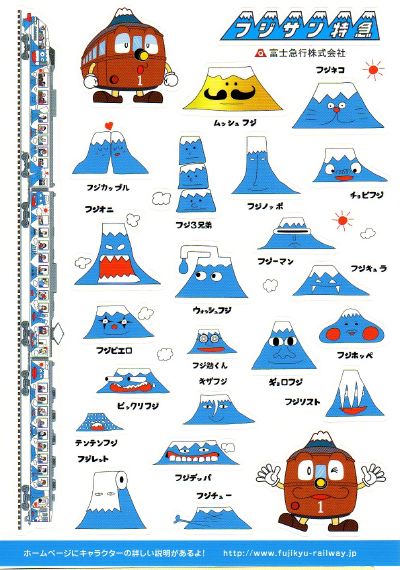 都留市駅で買ったフジサン特急のシールはこのようになっている。フジニッコリ、ミスターフジ、ビックリフジなど一つずつ名前のついたキャラクターがたくさん出てくる。これが特急列車の車体に描かれているのである。その数なんと101個だそうである。