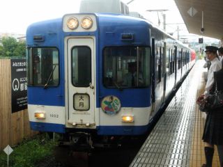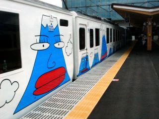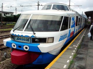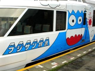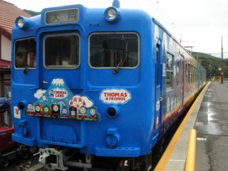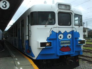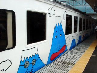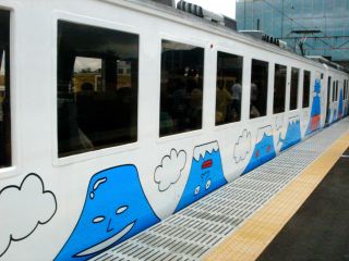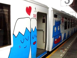 次に大月方面から河口湖へ向かうフジサン特急が富士山駅に到着した。フジサン特急の車体にはいろいろなフジサンのキャラクターが描かれている。