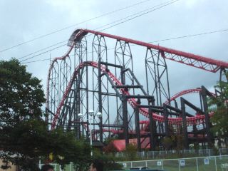 富士山駅から河口湖駅へ向かってフジサン特急が出発した。向かって右側の線路から来たが、左側の線路を通って行くのである。次は富士急ハイランド駅であり、アトラクションが駅の至近に見られる。