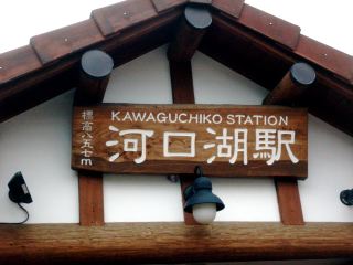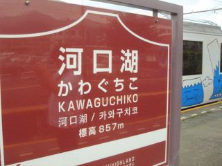 河口湖駅に着いた。駅では茅原実里の肉声でのコンサートの案内が流れていた。そして隣のホームにはトーマスランド電車が停車していた。駅舎には大きな売店などで賑わっている。