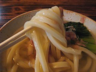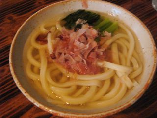 まず、お新香が出てきた。目の前のおじいちゃんは、吉田うどんの食べ方の説明をしてくれたり横浜の話しをしたりして楽しめた。ダシはとても薄いので卓上の醤油や辛味噌をお好みで入れて味を整えるのだ。うどんはやや柔らかめ。具は鰹節とほうれん草。他のテーブルのお客さんの中には2杯食べている人も多い。