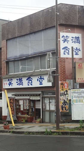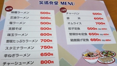 二戸駅からこの笑満食堂が見えました。メニューは、味噌ラーメン500、正油ラーメン500、塩ラーメン500、支那そば500、味玉ラーメン600、野菜たっぷりラーメン700、スタミナラーメン750、チャーシューメン800、チャーハン500、豚丼600、オムライス700、野菜炒め定食650、鶏唐揚げ定食680、餃子定食500などです。