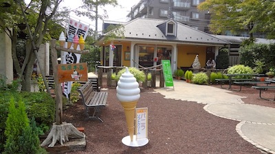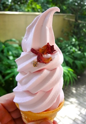 あまりに暑いので売店でバラソフトクリームを買って、日陰で噴水をみながら食べました。