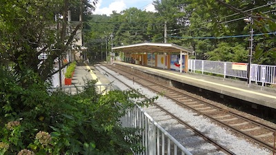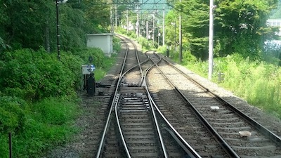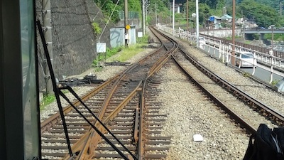 最も左側の線路が箱根登山電車の標準軌道の線路で、右側と真ん中が小田急線の狭軌です。入生田駅までの三線軌条はここから始まります。