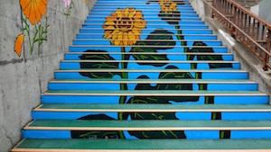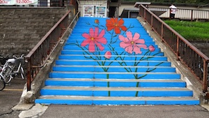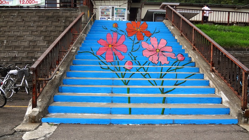 駅舎までの階段の側面には、町の花であるヒマワリと日本最大級のコスモス園があることからコスモスがデザインされています。