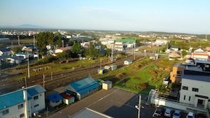 今朝も目覚ましが鳴る前にスッキリと目覚めました。今日は10月6日(土)ですので、世間的には今日から三連休という人が多いはずです。天気は素晴らしい快晴!です。昨夜は日が暮れていて気づかなかったのですが、ホテルの部屋からオホーツク海が見え、また線路も見下ろせます。前日に買っておいたおにぎりとカップ味噌汁とで部屋で朝食を取ります。そしてゆっくりとホテルを後にします。