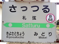 札弦駅は“つるつるステーション”の攻略対象駅の一つなのです。待合室にはカラフルなイスが並び、駅前からまっすぐ伸びた一本道がその先で主要道と直交しています。周囲の家々の庭は広く芝生が敷かれています。何となくアメリカの風景のような錯覚に陥ります。わずか21分の滞在で札弦駅を後にします。